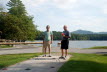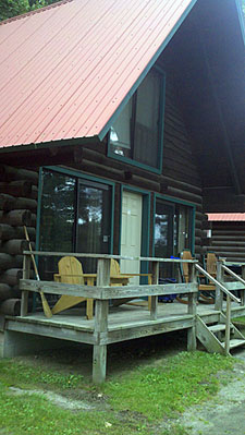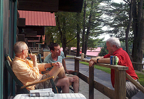 Got to the ranch about 1 pm Friday and settled in to our A-frame Chalets. We took advantage of the lunch (meals were (jncluded) where they served us sandwiches and/or meatloaf (only Gene was brave enough). The rest of us played it safe with the sandwiches. After lunch we pulled out our coolers and played a little whiffleball, shot some baskets, and tried our hand at shuffleboard. Fair to say we sucked at all 3. From there we decided to sit and enjoy the view of the lake (Sherman Lake) on their lounge chairs where we met Danielle from Montreal who has been going to the Ranch for over 30 years. She and her daughter were there for the weekend. Before we knew it, Danielle was yelling at Hoff (not THE Hoff, nor our own Huff) but a worker at the ranch who was the activities director. She asked Hoff if he would take us around the lake on the pontoon boat. So, off we went.... all of us and Danielle. Now, this is a very small lake (‘bout the size of Sunset Lake in Braintree) and we were out there for about 2 hours... we probably made 20 long circular trips. Nonetheless, the beverages were flowing and we were beginning to get into the “camping mode”.